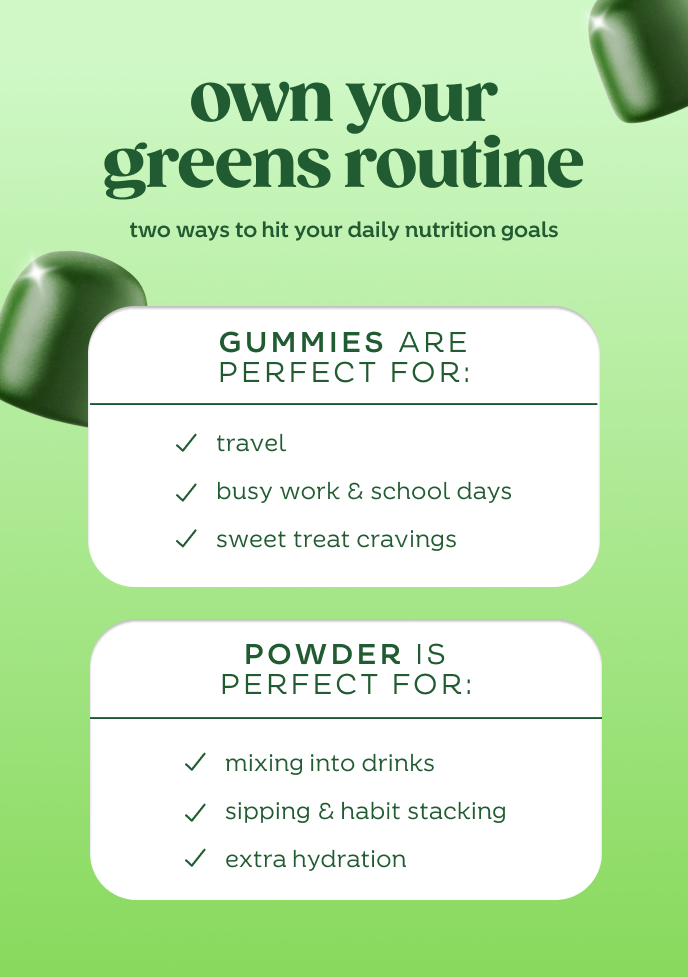 Our Supergreens Gummies make it easier than ever to fill the gaps in your diet, support gut health, and bloom into your best self!”
