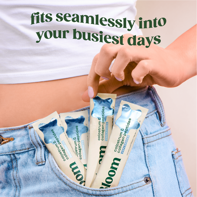 Colostrum is the first milk produced by cows immediately after giving birth. It is rich in antibodies, growth factors, and antioxidants that help to nourish and build a calf's immune system. While collagen is a protein that our bodies naturally produce to give our skin elasticity and support bones & joints. As we age, our bodies gradually make less collagen. So Colostrum & Collagen work together to support immunity, balance gut health, and nourish hair, skin & nails.
